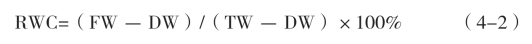 取样方法同植物叶片δ13C值测定,取样后快速测定叶片鲜重(FW),然后将叶片放入装有蒸馏水的容器(塑封袋)中,在4℃冰箱保存12 h以上。用吸水纸吸去叶片表面水分,称量叶片重,恒定后的重量即为叶片饱和重(TW)。然后将叶片在65℃烘箱烘干48 h 后测定叶片干重(DW)。计算相对含水量: