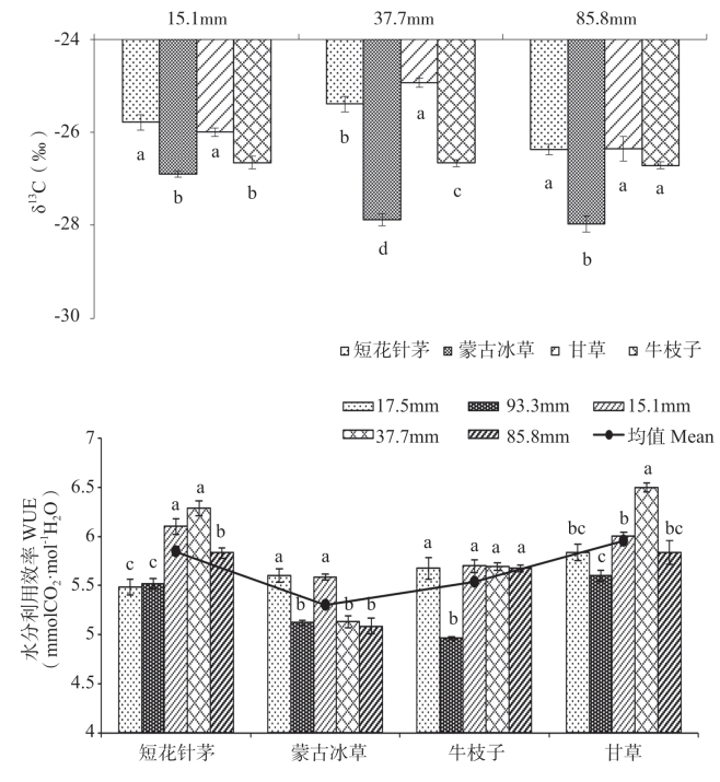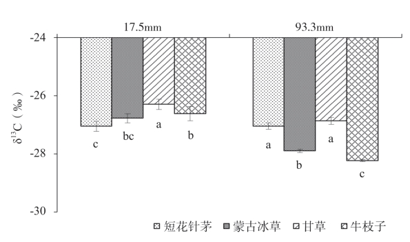 植物生长季不同降水期4 种优势植物叶片δ13C 值的测试结果显示(图4-2),2016年17.5 mm 降水期不同植物δ13C 值顺序为:甘草(-26.30‰ ±0.25‰)>牛枝子(-26.62‰ ±0.34‰)>蒙古冰草(-26.78‰±0.22‰)>短花针茅(-27.05‰±0.25‰),且甘草的δ13C 值显著高于其他4 种植物;93.3 mm 降水期不同植物δ13C 值顺序为甘草(-26.87‰±0.21‰)>短花针茅(-27.04‰±0.19‰)>蒙古冰草(-27.90‰ ±0.09‰)>牛枝子(-28.23‰ ±0.06‰),其中,甘草、牛枝子和蒙古冰草的δ13C 值显著偏负,其均值分别降至-26.87‰、-28.23‰和-27.90‰,降幅在0.57 ~1.61。整体来看,在同一时期4 种植物δ13C 值的种间差异均达到显著水平(P <0.05),不同降水期,牛枝子、蒙古冰草和甘草的δ13C 值变化显著(P <0.05),而短花针茅则无显著变化(P >0.05)。2017年,随着降水量增多,短花针茅、甘草和蒙古冰草δ13C 值变化显著(P <0.05),呈减少趋势,而牛枝子δ13C 值平缓减少且变化不显著。在37.7 mm 降水期,甘草的δ13C 值显著偏正,为最大值(-24.94‰),其次为短花针茅(-25.09‰);在85.8 mm 降水期,蒙古冰草δ13C 值最小(-28.15‰)。整体分析,不同植物δ13C 值为甘草>短花针茅>牛枝子>蒙古冰草。
