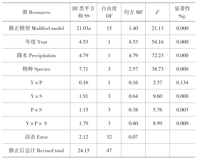 表4-2 植物δ13C 值组成在年度、降水量与物种之间的方差分析