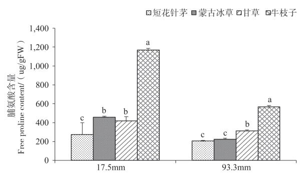如表4-4所示,不同降水量显著影响植物叶片脯氨酸含量 (P <0.05),降水量与物种之间对脯氨酸含量有显著交互效应(P <0.01)。不同降水量对不同植物脯氨酸含量的影响差异显著,降水量越大脯氨酸含量越小,4 种植物的脯氨酸含量在93.3 mm 降水期相比17.5 mm 降水期降低了59.4%。4 种植物的脯氨酸含量相比(如图4-4 所示),牛枝子>甘草、蒙古冰草>短花针茅,且种间差异均达到显著水平(P <0.01),其中,牛枝子的脯氨酸含量在17.5 mm 降水期最大,而在93.3 mm 降水期蒙古冰草和短花针茅二者的脯氨酸含量最小。