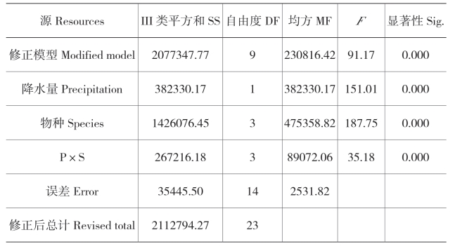 表4-4 降水量对不同植物脯氨酸含量影响的双因素方差分析