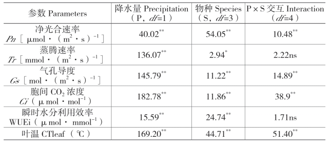 表4-5 降水量与物种对净光合速度、蒸腾速率、气孔导度等参数影响的方差分析