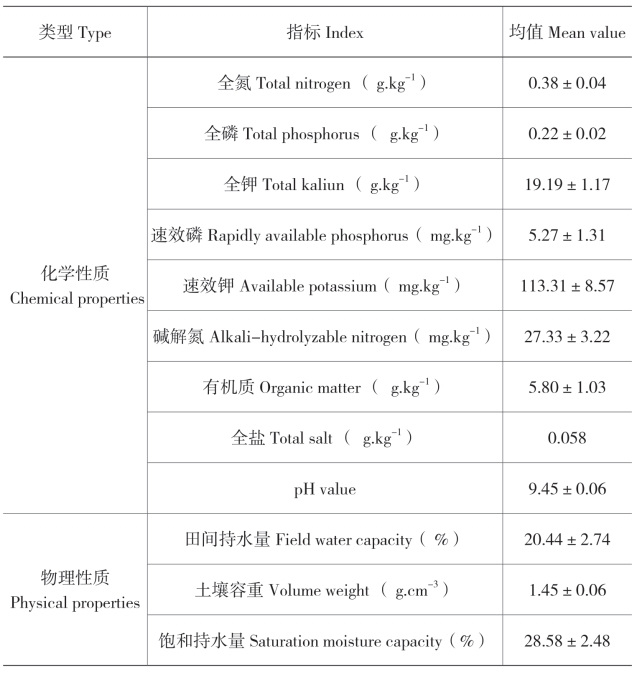 在盐池县高沙窝试验样地采集0 ~20 cm 土层荒漠土,运回至宁夏大学农学院农科试验基地(温室),充分暴晒3 天后,筛除杂草和石粒,分装于口径16 cm、高40 cm 自制PVC 塑料筒中,每盆装土7.5 kg,配置TCR 土壤含水量测试探管,筒底部用硬纱布封口,测定土壤物理化学性质、田间持水量(FC)和容重(BD),测试方法同第一章1.3.2,土壤有机碳、全氮、全磷、全钾、碱解氮、速效磷、速效钾、全盐及pH 值均采用鲍士旦法(2000)测定。试验用土的田间持水量为20.44%±2.74%,土壤容重为1.45±0.06 g·cm-3 ,与采样地无差异。土壤肥力低,偏碱性。土壤基本性质见表5-1 所示。