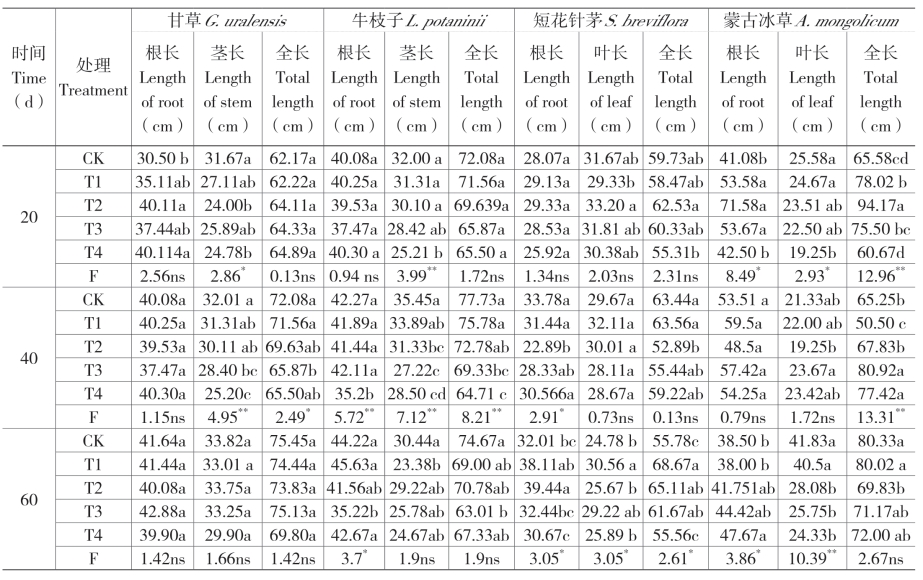 如表5-2、5-3 所示,不同程度的干旱胁迫处理对4 种植物幼苗茎(叶)长、根长及分枝(糵)、叶数均有不同水平的显著影响。甘草和牛枝子的生长变化相似,在胁迫初期(20 d)和中期(40 d),不同处理对甘草和牛枝子的茎长有显著差异(P <0.05),其中CK、T1、T2 处理下的茎长与T3、T4 处理之间有显著差异,但对根长的影响差异不显著。在胁迫处理60 d 后,不同处理之间的根茎长度未达到显著差异,但分枝数和叶数具有极显著差异(P <0.01)。在胁迫初期和中期(20 d,40 d),不同处理对短花针茅叶长、根长及分蘖数的影响未达到显著水平;在胁迫中后期(40 ~60 d)对各指标的影响差异显著(P < 0.05),生长高度随着胁迫程度加深而降低;不同处理之间的分蘖数和叶数达到了极显著差异(P < 0.01),亦随着胁迫程度加重而逐渐降低。在胁迫初期(20 d),蒙古冰草叶长、根长及分蘖数在不同水分处理之间均有显著差异(P < 0.05),其中,T1、T2、T3 处理的根长显著大于T4 和CK,而叶长在不同处理间差异不显著。在胁迫中期(40 d),蒙古冰草叶长、根长及分蘖数在不同处理之间的差异未达到显著水平,在胁迫末期,其根长、叶长、分蘖数和叶数显著增长且在不同处理之间具有显著差异(P < 0.05),从CK 到T4,根长逐渐增加,叶长、分蘖数和叶数均逐渐降低。