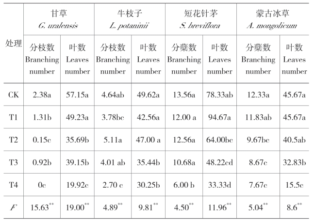 Table 5-2 Effects of different water treatments on branches (tillers) of 4 plant species