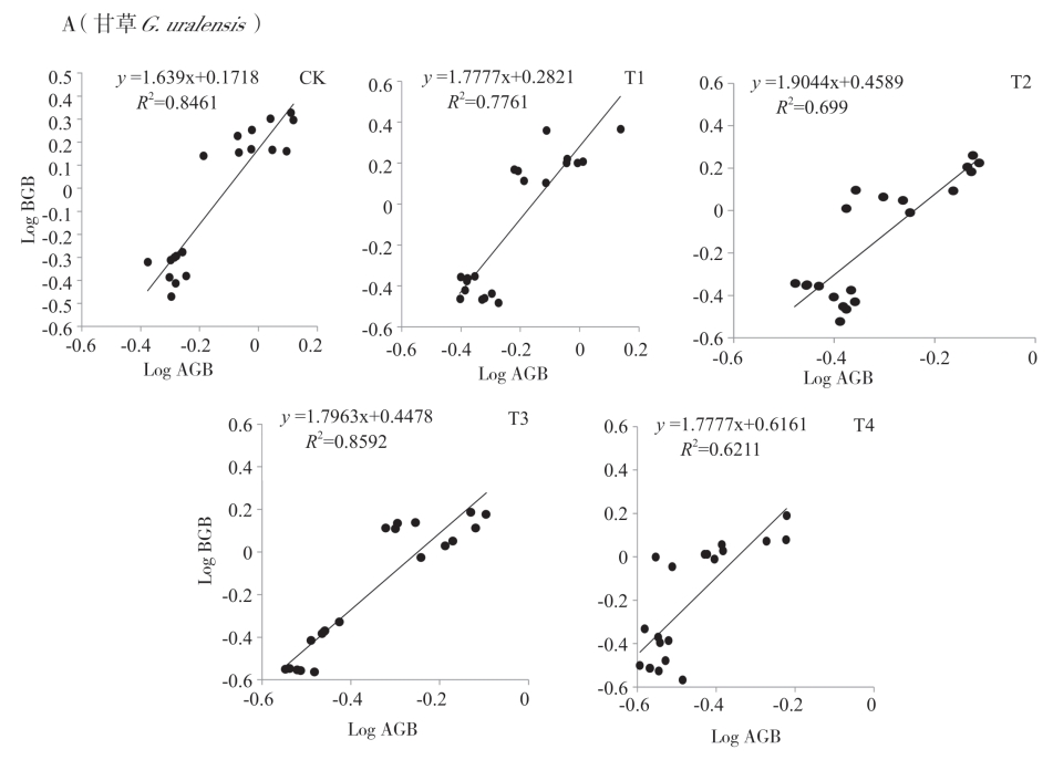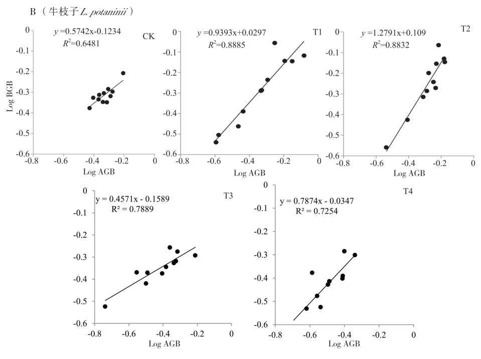 由图5-2 可以看出,4 种植物在不同处理下的地下、地上生物量之间具有不同的相关生长关系(P < 0.05),且表现为异速生长关系。甘草偏向于地下生物量积累的异速生长,甘草在各处理的相关生长指数α 均大于1,其中T3 的相关生长指数α 最大(α=1.9),CK 处理下最低,T3 处理的相关生长关系最好,R2=0.8592。牛枝子在胁迫后期与前期之间的生物量变化差异较大,整体看没有显著的相关生长关系,将胁迫初期与中期的地上、地下生物量进行相关分析发现,CK、T3、T4 处理表现为偏向于地上生物量积累的异速生长关系,T1 和T2 处理具有极显著的相关生长关系(P < 0.01),α 值接近1,具有等速生长关系。