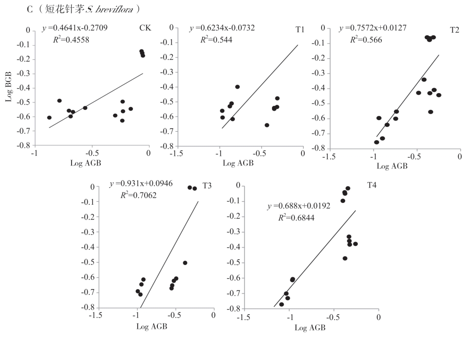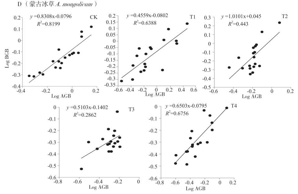 短花针茅和蒙古冰草偏向于地上生物量分配的异速生长。其中,短花针茅在T3 处理下的相关生长指数α 接近1,其地上与地下器官具有等速生长关系,其他处理的相关生长指数α 均显著小于1,表现为异速生长关系,CK 处理的相关生长关系未达到显著水平(R2=0.4558)。蒙古冰草在T2 处理下的相关生长指数α 接近1,其地上与地下器官具有等速生长关系,其他处理的相关生长指数α 均显著小于1,表现为异速生长关系,CK 处理相关生长关系达到了极显著水平(P < 0.01,R2=0.82)。