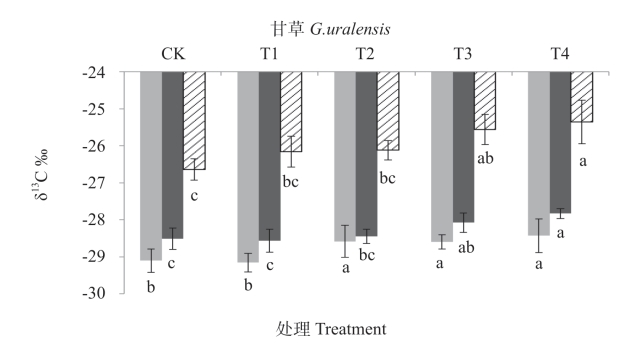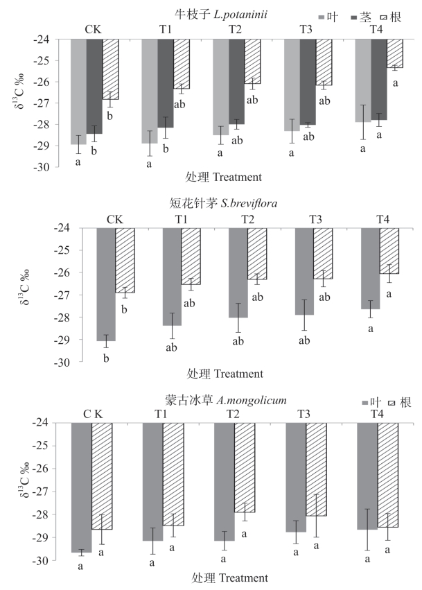 经两因素方差分析(见表6-1),结果表明4 种植物在不同干旱胁迫强度之间,不同器官的δ13C 值和Δ13C 值均存在显著差异( P <0.01),4 种植物的δ13C 值和Δ13C 值有显著的种间差异(P <0.01),且处理与物种对4 种植物根的δ13C 值和Δ13C 值影响存在显著的交互效应(P < 0.01),对叶和茎的影响交互效应不显著。在不同干旱胁迫处理下,甘草各器官δ13C 值在-24.58‰ ~-29.40‰变化,均值为-27.68‰ ;牛枝子各器官 δ13C 值在-25.27‰~ -29.49‰变化,均值为-27.58‰ ;短花针茅各器官 δ13C 值在-25.59‰~-29.42‰变化,均值为-27.31‰ ;蒙古冰草各器官 δ13C 值在-27.52‰~ -29.74‰变化,均值为-28.72‰。4 种植物不同器官之间δ13C 值在不同干旱胁迫处理下具有显著差异,甘草各器官δ13C 值表现为δ13C根> δ13C茎>δ13C叶,牛枝子各器官δ13C 值表现为δ13C根> δ13C茎>δ13C叶,短花针茅各器官δ13C 值表现为δ13C根>δ13C叶,蒙古冰草在CK、T1 和T2 处理下各器官δ13C值表现为δ13C根>δ13C叶,T3 和T4 处理下叶和根的δ13C 值无显著差异。总体来看,4 种植物根δ13C 值大小为:甘草>牛枝子>短花针茅>蒙古冰草;叶δ13C 值大小为:牛枝子、短花针茅、甘草>蒙古冰草。随着干旱胁迫加剧,4 种植物各器官的δ13C 值均呈上升趋势(见图6-1),甘草各器官在严重干旱胁迫(T3、T4 )处理下的δ13C 值显著大于中度、轻度及正常供水处理(CK、T1、T2)(P <0.05)。牛枝子叶的δ13C 值在不同水分梯度之间未达到显著性差异,茎和根δ13C 值在不同水分梯度之间有显著性差异。短花针茅根和叶的δ13C 值在不同水分梯度之间均具有显著性差异。蒙古冰草根和叶的δ13C 值在不同水分梯度之间均未达到显著性差异。