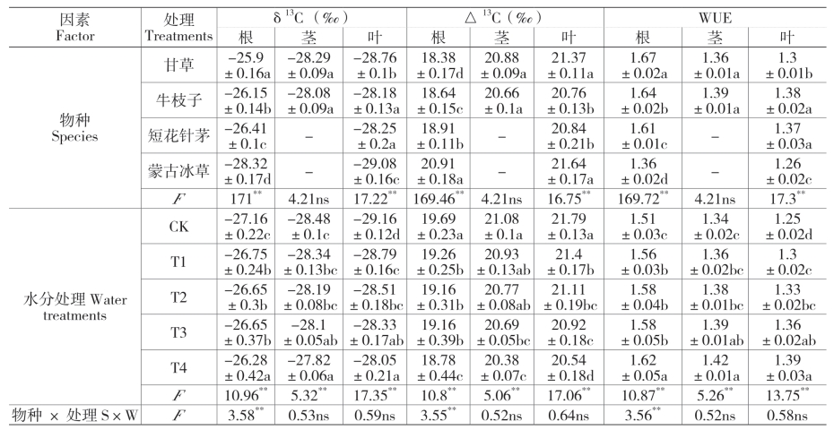 表6-1 不同干旱胁迫处理对4 种植物叶δ13C、△13C 值及WUE 影响的方差分析(Mean±SE)