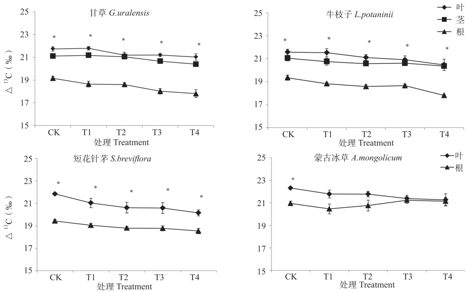 表6-1 中,不同干旱胁迫处理下4 种植物各器官Δ13C 值随着干旱胁迫的增加而减小,甘草、牛枝子和短花针茅的根、茎、叶的Δ13C值在正常供水处理(CK)条件下显著大于严重干旱胁迫(T3、T4)处理(P <0.05)。3 种植物不同器官之间Δ13C 值具有显著差异,总体看,根的Δ13C 值显著小于叶和茎的,而茎和叶之间无显著差异。如图6-2所示,甘草和牛枝子各器官Δ13C 值均值表现为Δ13C 叶>Δ13C 茎>Δ13C 根。短花针茅各器官Δ13C 值均值表现为Δ13C 叶>Δ13C 根,都会随着水分减少呈现持续减少的变化趋势。蒙古冰草叶的Δ13C 值随着水分减少呈现持续减少的变化趋势,根的Δ13C 值则呈先减少后增加的变化趋势。
