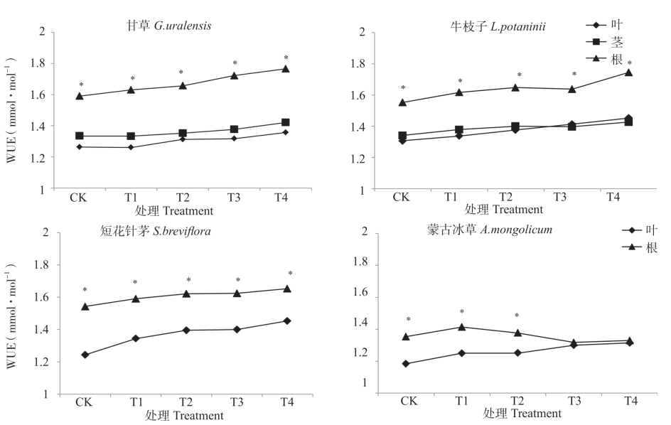 如图6-3 所示,随着干旱胁迫强度增加,甘草根、茎、叶的WUE持续增加,根的WUE 增加幅度显著大于茎和叶,T4 处理下根、茎、叶的WUE 比CK 分别提高了11.05%、6.58%、7.35%。在同一处理条件下,甘草各器官WUE 表现为根>茎>叶,但茎和叶的WUE 之间差异不显著。牛枝子根、茎、叶的WUE 随着干旱胁迫强度增加也持续增加,其中,T3 处理根的WUE 略有下降,T4 处理又显著上升,相对根和叶的WUE 增加幅度显著大于茎,T4 处理下根、茎、叶的WUE 比CK 分别提高了12.38%、6.32%、11.11%,各器官WUE 表现为根>茎、叶。短花针茅根和叶的WUE 随着干旱胁迫强度增加也呈上升趋势,其中,叶的WUE 增加幅度显著大于根,T4 处理下叶、根的WUE 比CK 分别提高了16.86%、7.17%,各器官WUE 表现为根>叶。蒙古冰草叶的WUE随着水分胁迫强度增加也持续增加,T4 处理下的WUE 比CK 增加了11.05%,但根的WUE 在T2 处理下开始下降至T4 处理,使叶和根的WUE 无显著差异。