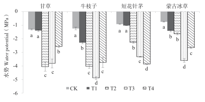 图6-4 不同干旱胁迫处理下4 种植物叶水势的变化