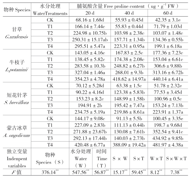三因素方差分析结果表明(见表6-3),物种、处理与胁迫时期对植物叶片脯氨酸含量均有极显著影响(P <0.01),4 种植物之间的脯氨酸含量有极显著的种间差异(P <0.01),三因素之间对脯氨酸含量均有显著交互效应(P <0.01)。牛枝子和蒙古冰草的脯氨酸含量显著大于甘草和短花针茅。