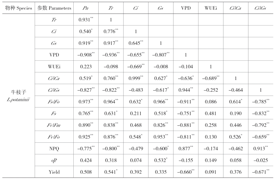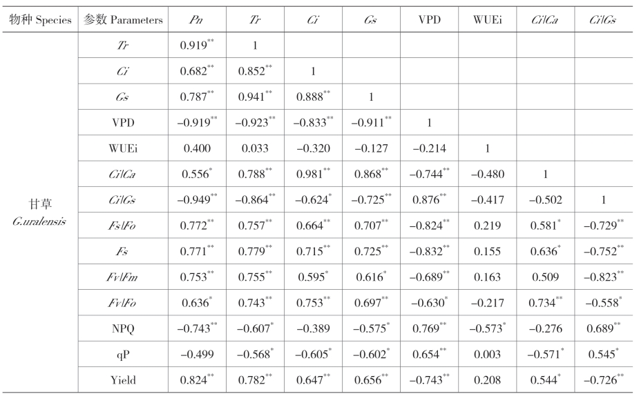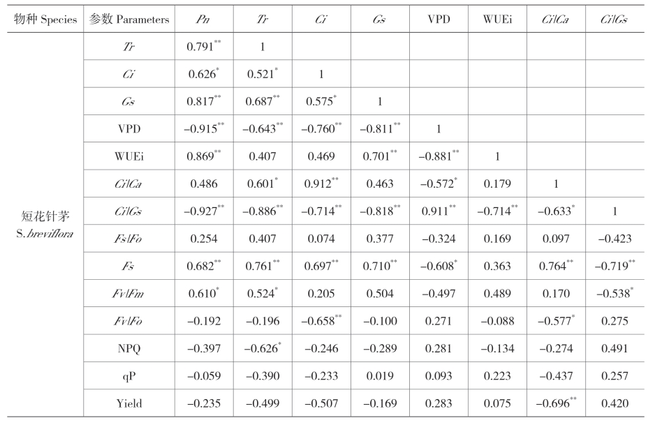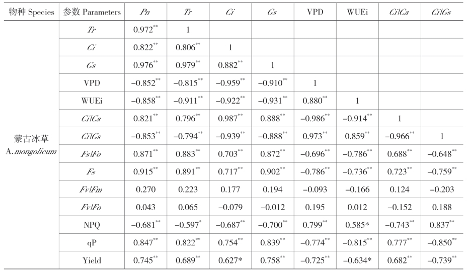 短花针茅的Pn、Tr、Ci 及Gs 两两之间具有显著正相关关系,Pn、Tr、Ci、Gs 与VPD、Ci/Gs 两两之间具有显著负相关关系,WUEi 与Pn、Gs 显著正相关,与VPD、Ci/Gs 显著负相关。光合参数中Pn、Tr、Ci、Gs、Ci/Ca 与叶绿素荧光参数中的F s 呈显著正相关。Pn、Tr 均与Fs 具有最高的相关系数,Ci 与Ci/Ca 最相关,Gs 与Ci/Gs、VPD、Fs 相关系数分别为-0.82、-0.81、0.71,Ci/Gs 与VPD 相关系数达到了0.91 以上。蒙古冰草的Pn、Tr、Ci、Gs 及Ci/Ca 两两之间具有极显著正相关关系,Pn、Tr、Ci、Gs、Ci/Ca 与VPD、Ci/Gs、WUEi 之间具有极显著负相关关系。Pn、Tr、Ci、Gs、Ci/Ca 与Fs/Fo、Fs、qP、Yield 两两之间呈显著正相关,与NPQ 呈显著负相关。Pn 与Ci/Gs、Tr 的相关系数均达到了0.97 以上,与叶绿素荧光参数中的Fs 相关性最强;Tr 与VPD、WUEi 的相关性系数达0.91 以上,与叶绿素荧光参数中的Fs 相关性最强。Ci 与Ci/Ca、VPD、Ci/Gs、WUEi 的相关性均达到了极显著水平,与叶绿素荧光参数中的qP 相关性最强;Gs 与NPQ 的相关性系数最大,其次为qP、Fs/Fo、F s。Ci/Gs 与NPQ、qP 的相关性系数达到了0.84 以上,WUEi 与qP 的相关性最强。