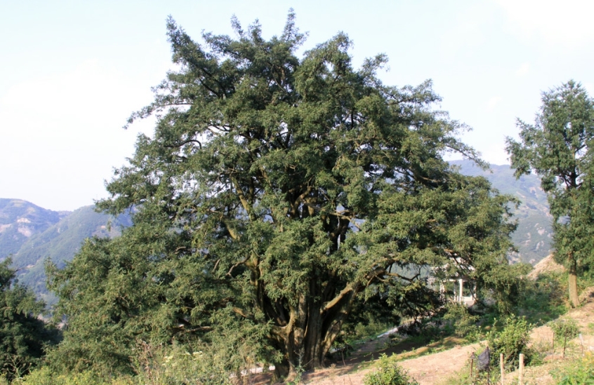 在浙江省诸暨市的赵家镇,有一株1300多年的古树,这是中国已发现的最大的香榧树,被誉为“中国香榧王”。它树高18米,树围最粗处达到了9.26米,整个树冠如同一顶巨大的绿色帐篷,把树干包裹其中。由于它的发现,附近原本叫作“西坑村”的村庄改名为“榧王村”。