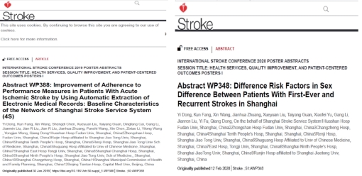 在稳定、连续的数据抓取、质控监测及临床行为反馈的系统管理下,上海卒中预防与救治体系获得了连续稳定的数据库平台。基于此数据平台数据,上海市神经内科临床质量控制中心于2019年、2020年连续两年在国际卒中年会(International Stroke Conference)与国际同行交流了我们的初步研究结果,并同期发表于Stroke杂志上(图1-1)。