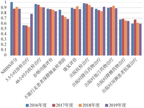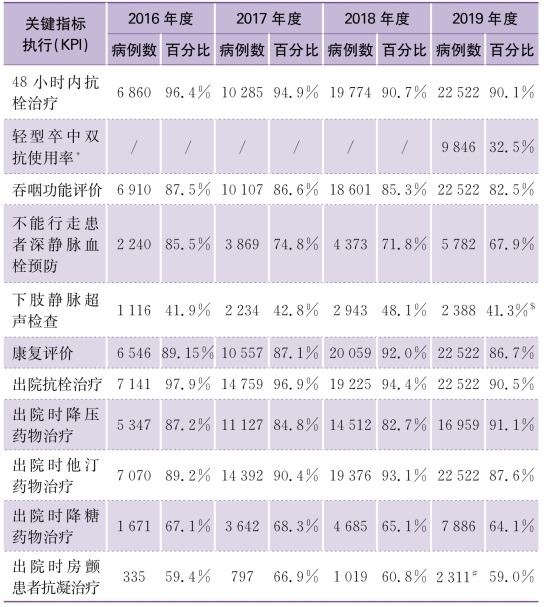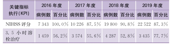 脑梗死单病种医疗质量关键绩效指标(key performance indicator,KPI)情况分析见表2-6。2016—2019年度KPI比较见表2-6及图2-6,整体溶栓比例逐年增加。