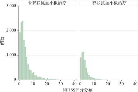 图2-7 是否使用双联抗血小板治疗情况与N IH S S评分分布的情况