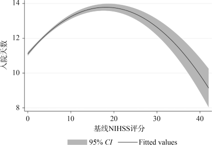 在体系数据平台显示,脑梗死单病种中位数住院天数12(四分位数9~15)天。住院天数与卒中严重程度成U形相关,见图2-10。