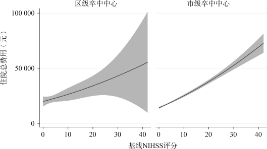 图2-12 市级vs.区级卒中中心基于基线严重程度分析住院总费用的差异性