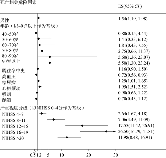 图2-13 2019年度上海缺血性卒中患者死亡预测因素分析森林图