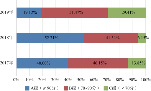 1.68家被督查的医疗机构(含分院分部)中,13家(19%)单位获得了A级(90~100分),其中嘉定区中心医院以95.77分的成绩夺得头筹。另有35家(51%)单位获得B级(70~89分),总体优良率70%,较2018年(93.85%)有所下降(附图2-1)。