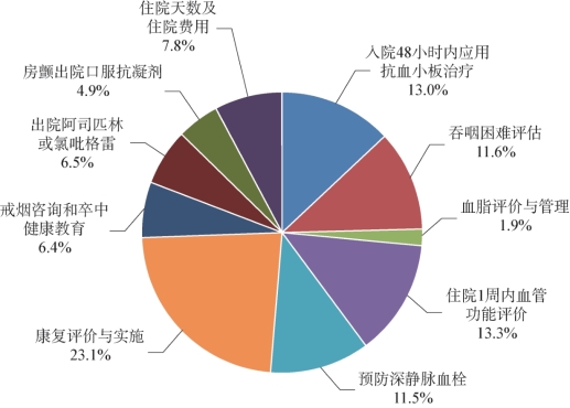 3.缺血性脑血管病专业技术水平主要存在的问题:本年度缺血性脑血管病主要扣分项(≥10%)按扣分百分比排列为:康复评价与实施(23.1%)、住院1周内血管功能评价(13.3%)、入院48小时内应用抗血小板治疗(13.0%)、吞咽困难评估(11.6%)和预防深静脉血栓(11.5%)(附图2-5)。