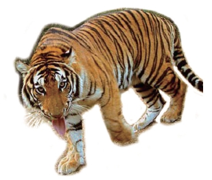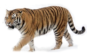 华南虎:头圆,耳短,四肢粗大有力,尾较长,胸腹部杂有较多的乳白色,全身橙黄色并布满黑色横纹。