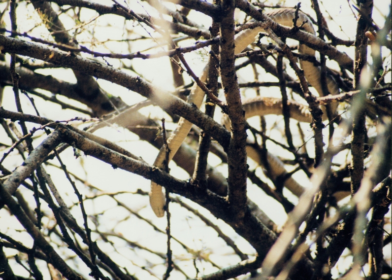 黄昏中的树冠更显昏暗。但我们还是找到了大蛇,以它潜伏、潜行状态推测,它已锁定了目标。是的,有两只织布鸟正忘情地唱着,在树枝上跳着。大蛇慢慢地接近,突然,蛇头闪电一击……枝头只飞起一只鸟。