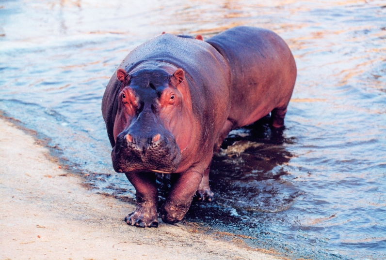 河马体格庞大,总有三四吨重,是生活在淡水中的最大的动物。浑身肉乎乎的,没长一根毛,光滑的皮肤黑得发蓝,简直就是个橡皮圆桶。光看它四条粗腿,会以为是大象腿,只是太短了。