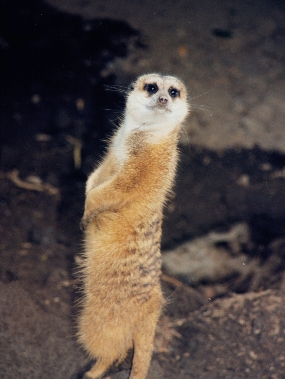 那天在看大象蹭痒时,偶尔相见,在洞口的猫鼬马上立起上身,站立——把尾巴撑在地下,两前肢垂在胸前,注视着我,很像我们在冰山之父慕士塔格峰下看到的旱獭。它也是这副模样站在洞口,毛色也是金黄,但个头一个是猫鼬的好几个……
