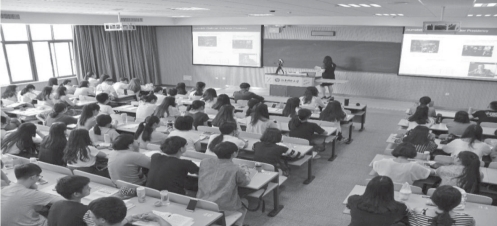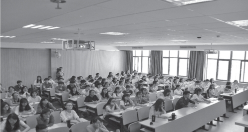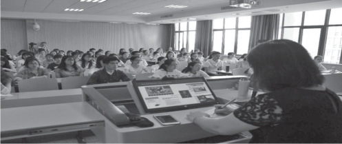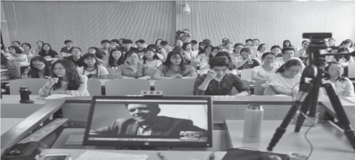 在以上展示的影像资料里,可以看到与学生们同处一室的教师王妤彬老师,在大屏幕上出现的是美国罗伯森传媒与文化学院的Marcus教授。授课的时间是2017年5月10日的上午。说来也巧,那天笔者原本并不知道会有这么一场特别的教学,走进麦庐校区3303教室后才发现居然有这样一堂课。结合课间的耳闻目睹和课后与王妤彬老师的交流,笔者试着对当时的课堂教学及其课堂教学的产生缘由、特点、效果及其他相关做一些介绍。