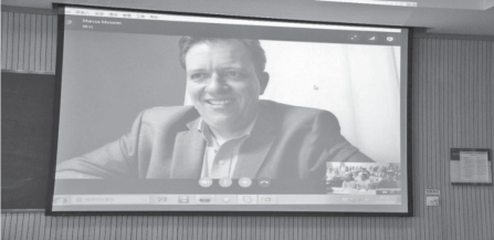 视频连线教学在上午八点十五分开始。虽然当时美国正是夜晚,但出现在屏幕上的Marcus教授显然为了这次教学做了精心的准备和特别的安排。在王妤彬老师带领学生和Marcus教授通过连线视频互致问好之后,Marcus教授就开始了他对中国学生的授课。虽然这次全程英语教学,学生们会因为语言的问题而有些信息接收的困难,但Marcus教授特地为这次课程学习准备的教学课件早已发送给王妤彬老师,王妤彬老师课前已结合学生课程学习的实际情况进行了分析,同时,学生们对这次课程学习需要向Marcus教授请教的问题,之前也已经由王妤彬老师先期传送给了Marcus教授。特别是针对学生们的实际情况,王妤彬老师与Marcus教授在课前交流了许多问题,比如学生整体的英文水平如何,也做过一些实验,确定比如讲课使用中等偏慢语速的规则,所以,在Marcus教授采用中等偏慢语速的英语进行授课的过程中,王妤彬老师也在仔细地记录着Marcus教授的讲授要点,不时地移动鼠标,引导学生随着Marcus教授的声音察看课件,同时舞动粉笔,在黑板上写下需要注意的关键句子和关键词。Marcus教授讲课中的许多内容在国内是找不到的,在学生与Marcus教授的互动中,学生们在王妤彬老师的鼓励下,大胆地向Marcus教授表达,与Marcus教授交流,双方互动十分积极。因而,在笔者看来,这次教学不仅以教学形式的新颖取胜,而且其中的内容教学非常务实,富有效果。而实际上,这次课堂教学让学生收获很多,一是Marcus教授在课后给王妤彬老师的邮件里,特意夸了学生们,说学生们的思维很活跃,提出的问题也很不错。二是王妤彬老师在课后也正在对Marcus教授的课件做后期的编辑处理,加上英文字幕和中文翻译,让学生可以回头再看和让更多的学生可以学习。