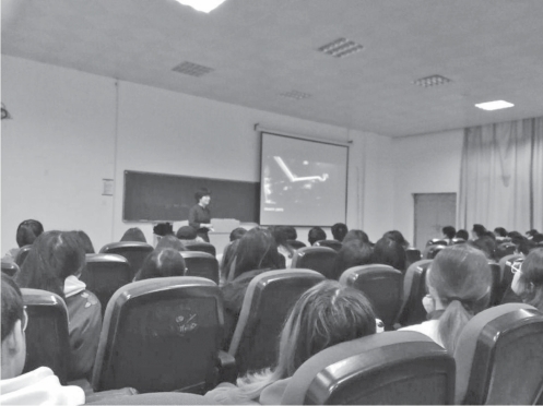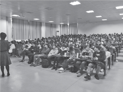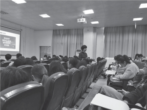 一眼望去,将近两百的大学生几乎把教室坐得满满的。而此情此景似乎丝毫没有使任课老师感到胆怯,在笔者的眼里,她却反而显得更富有自信,那种成竹在胸般的从容自在、挥斥方遒般的激情盎然、行云流水般的课程讲授,让在场的学生充满了对老师的信任和对课程的兴趣。即便用来上课的教室不是一般意义上的教室,而是常用来讲座的学术报告厅。上课的学生有些能够适应环境而在座位左侧的书写板上看书、记笔记,但即使是不适应环境的将书本、笔记本之类摊放于双腿之上进行课堂学习的学生,也有较高的学习兴致和热情。这是周婧老师的影视鉴赏课程教学课堂。