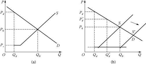 在中国股票市场,企业的证券供给价格存在着某种最低限制,表现在实践中即为证券发行价格不能低于其净资产,而在模型中则表现为供给曲线单调上升之处的水平情形。在图4-1中,市场达到均衡时的价格与数量分别为P0和Q0,它是企业的证券供给曲线与居民的证券需求曲线的交点。但是,如果政府对证券市场中的供给数量进行干预,即通过股权分割与国有股份暂不上市流通等制度安排来控制市场中的证券流通数量,则可能在证券市场上创造租金。考虑此种情况,如图4-1(a)所示,我们假设均衡状态下市场发行的证券总量为Q0,但是,在政府管制下市场实际流通股份仅为Qd(Qd<Q0),此时居民对证券的需求价格Pd,而企业的供给价格仅为Ps。价格差额Pd-Ps即构成了证券市场的制度租金。如果考虑租金效应,如图4-1(b)所示,将证券供给曲线外移至S′。假定市场流通比例为一简单固定常数,则市场流通数量相应增大,为Q′d(Q0>Q′d>Qd),而市场需求价格则为P′d。显然,P′d<Pd,这意味着居民获得证券的价格比原先要低,租金效应使其境况得到改善。从市场供给价格来看,实践中证券发行价格不能低于其净资产的规定决定了其将保持不变(P′s=Ps),尽管市场供给量的增加导致企业为争取上市资格所付出的各种额外费用也相应增大,但这与所获得的资金融通效用来看显得微乎其微,因此,从证券供给数量的增加使得企业的整体境况也得到了改善。