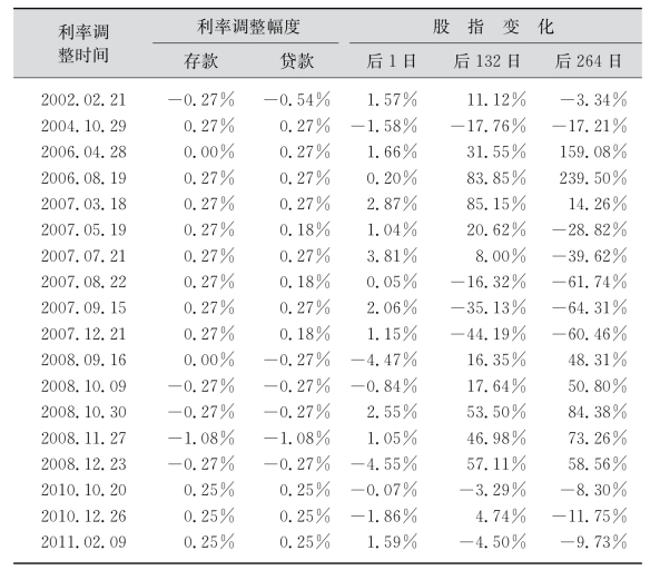 中国股市建立后至今,利率调整只经历了两个并不完整的周期,两个周期的分界点在2002年2月21日,在2002年之前利率调整基本上以降息为主要特点,2002年之后基本上以升息为主要特点,并且自2002年以来我国证券市场逐渐地发展,更符合我们现在的经济状况和市场行情。因此,我们选取的数据就从2002年2月21日开始。表5-2是2002年2月21日—2011年2月9日利率的调整对股市的影响表现,样本是从2002年2月21日—2011年2月9日。为了更全面地研究利率调整对股票市场的影响,我们从短期、中短期、中期、长期的反应来观察利率调整后股市的变化。对于股市,短期一般指的是买卖周期是一天或者几天,中期一般指的是买卖周期是3~6个月,长期指的是买卖周期在6个月以上,一般指的是一年以上时间持有股票,那么我们分别取1日、132日、264日来表示短期、中期、长期。近年中国利率调整与股票市场价格反应如下表5-2所示。