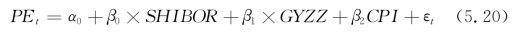 本回归的拟合优度为R=65.4%,说明市盈率和3个宏观变量具有很好的相关性,从表5-3中可以看出,各因变量的回归系数t值较大,有较高的显著性,线性关系明显。