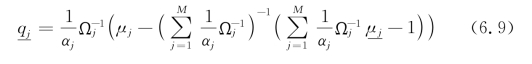 在式(6.8)中,价格是对资产收益的平均信念的表达,权重取决于投资者的风险厌恶系数和支付的方差协方差矩阵。直觉上,风险更加厌恶的投资者有越高的风险厌恶系数αj或者在方差协方差矩阵|Ωj|,他们的信念在资产价格的形成中所占权重就越小。除此之外,当然一个投资者所持资产越多,他的信念也会更大程度影响价格。把(6.8)式代入(6.7)式,可以得出每个投资者的最优持有风险资产头寸如式(6.9)。