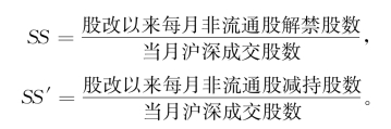 本方程考虑了滞后项,对国企指数选择滞后1期;对解禁类供给冲击SS选择了前瞻和滞后各1期;对减持类供给冲击选择滞后2期。解禁类供给冲击由于是事先即知的信息,因此,选择前瞻1期,解禁后观察其后1期,符合类似研究的惯例,事件日后过长时间的价量信息受到太多因素影响;对于减持类供给冲击,考虑之前为市场未知信息,因此,不引入前瞻1期数据,同时,减持信息的公开有一定迟滞,因此选择滞后2期数据。由于是月度数据,上述滞后期和前瞻期的选择理应是理性的。上证综指、深证成指、红筹指数、恒生指数等月度收益率数据均取自wind资讯。