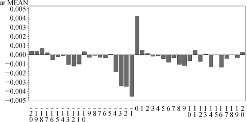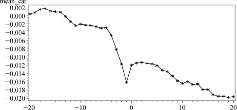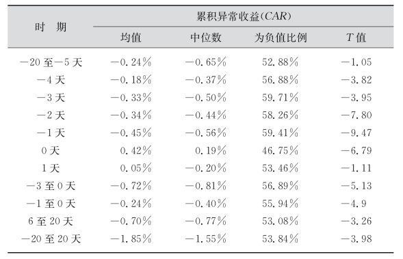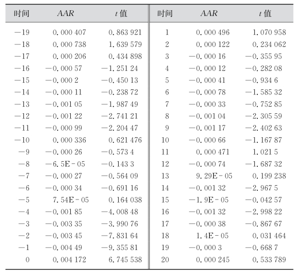 表7-1详细列出了估计时间窗口内每天平均异常收益率(average abnormal return,下面都用简写AAR表示)以及T检验的值,我们从表7-1可以看出,在T-4日AAR为-0.001 85,和之前的相比,出现明显大幅的跃升,其中T-1日的值达到了-0.004 49,达到了日负异常收益的最大值,但是在T0日出现了一个正的0.004 172的异常收益,T1日T2日略为正的异常收益,随后日异常收益一直都为负或接近于0的状态。