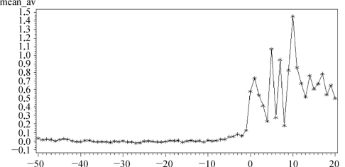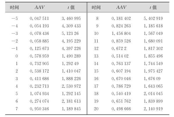 表7-3描述了异常成交量(average abnormal volume,AAV)的特征,其前半部分显示逐日异常成交量,自-5日开始,异常成交量在统计上都是显著的,在事件日及事件日后3天,平均异常成交量一直处于比较高的水平,平均异常成交量保持在50%以上。表后半部分显示永久性异常成交量(permanent abnormal volume,PAV),自+3日~+20日,期间平均异常成交量为65.8%且十分显著。