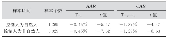 表7-13 按是否自然人控制分类样本区间异常收益率统计特征