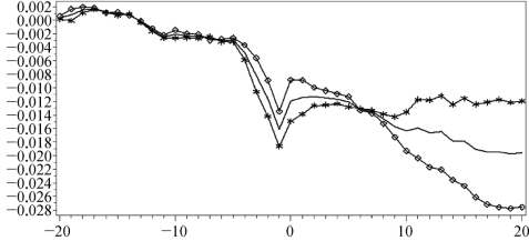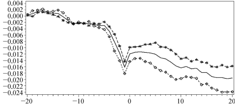 下面以10%的供给冲击为界,划分为两个样本,分别作出CAR图(图7-6),带方块的线条表示供给冲击在10%以上的样本的CAR图,带星号的线条表示供给冲击在10%以下的样本的CAR图,普通的线条表示全样本CAR图,从图7-6可以清晰看出,解禁股的比例(供给冲击大小)对解禁前后累计异常收益率有着明显的影响,供给冲击大的样本CAR跌幅一直大于供给冲击小的样本。这说明股价对解禁冲击比较敏感,解禁比例大的股票受到影响更大一些。