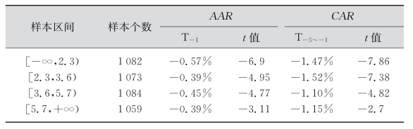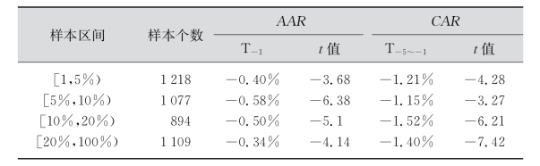 按照供给冲击大小将样本分为四个子集,分子集时候考虑到等分性和取整原则,[1%,5%),[5%,10%),[10%,20%),[20%,100%),相应的异常收益率如表7-8所示。