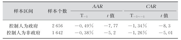 表7-6描述了按照控制人分类的样本区间异常收益率统计特征。从-1日的AAR来看,控制人为政府的反而略小于非政府控制的上市公司,从-5到-1天的累积异常收益率CAR上看,也是略小于非政府控制的上市公司,这和我们设想的有所出入,有可能是窗口期过短的原因导致。