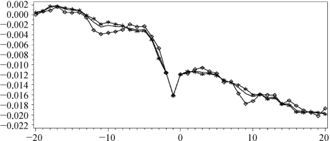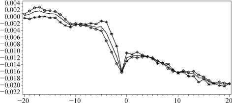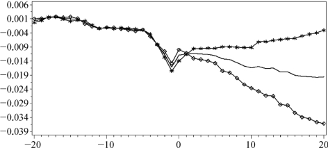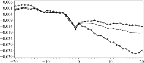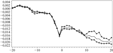 按照上面的样本区间划分,画出累积异常收益率CAR图(图7-5),其中带方块的线条表示政府控制的上市公司解禁的累积异常收益率CAR,带星号的线条表示非政府控制的上市公司解禁的累积异常收益率CAR,中间普通的线条表示全样本的累积异常收益率CAR。从图7-5可以清晰地看出,实际控制人为政府或者非政府在[-20,20]天的窗口期内并无显著差异,甚至政府为实际控制人的上市公司的累积异常收益CAR跌幅还略大一些。