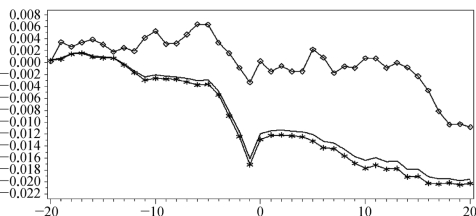 按照上面的样本区间,下面分别画出自然人控制上市公司样本CAR图和非自然人控制上市公司样本CAR图(图7-11),带方块的线条表示自然人控制的上市公司样本,带星号的线条表示非自然人控制的上市公司样本,从图7-11可以清晰地看出,是否自然人控制对样本累积异常收益率CAR没有明显的影响。