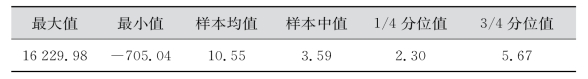 全部样本股估值的大小在此间分布并不均衡,最大值为16 229.98,最小值为负705.04,其均值为10.55,中值3.59,四分之一分位值和四分之三分位值分别为2.30和5.67。见表7-4。
