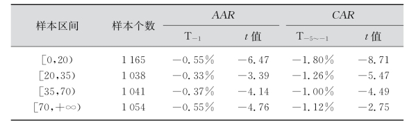 从表7-11中-1日的AAR看,市值小于20亿元的和市值大于70亿元的平均异常收益率AAR更小一些,市值在20亿~70亿元的上市公司没有显著区别,但是从-5~-1日CAR值来看,20亿元以下的小市值股票受到供给冲击时,累计异常收益率明显最小,统计也最为显著。20亿元市值以上的股票中,没有明显差别。