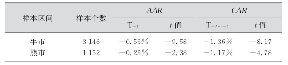 表7-12显示,在-1日AAR看,牛市要比熊市的异常收益率小一些,牛市在-1日的平均异常收益率为-0.53%,而在熊市只有-0.23%,且牛市更显著一些,说明解禁事件发生在牛市,对个股相对市场来说,影响更加明显。从-5~-1天的累积异常收益率CAR也可以看到这一点,-5~-1天的窗口期牛市累积异常收益是-1.36%,也显著低于熊市的-1.17%,t值也更加显著。